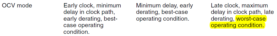3)On-Chip-Varient mode,允许同一个path在进行setup和hold check时,可以使用不同的PVT(operating mode)