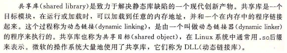 动态链接克服了静态链接的主要缺点。在动态链接的过程中,链接的不再是磁盘上的目标文件,而是加载到内存中的共享库,这个内存中的共享库在Windows上就是DLL文件,在Linux上就是.SO文件。