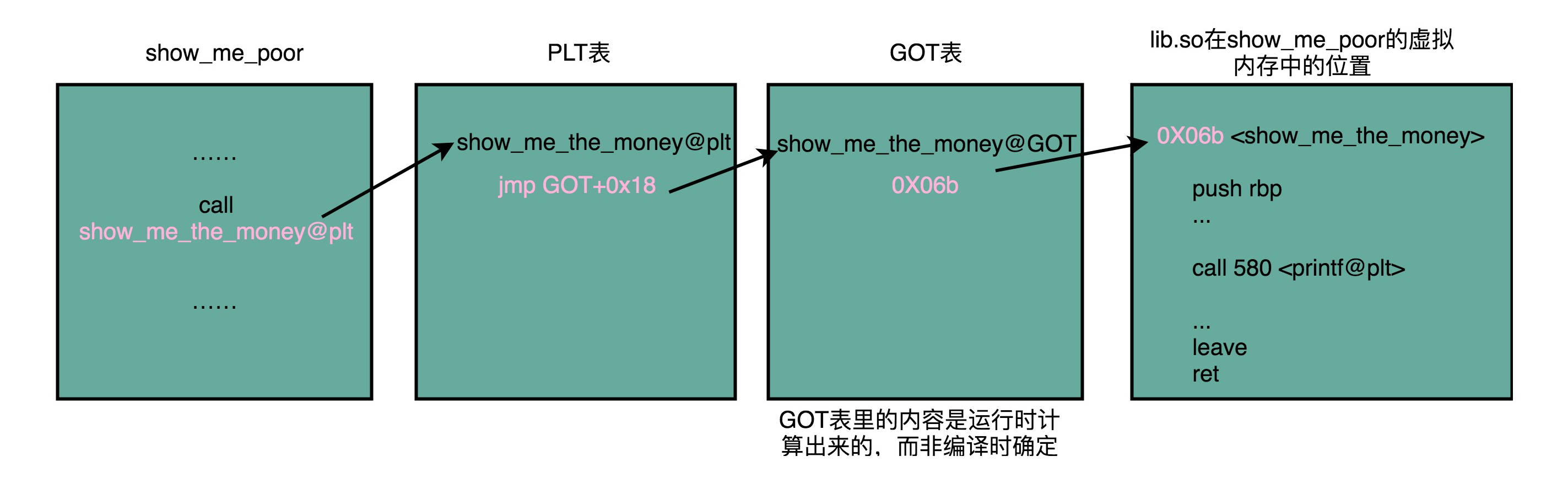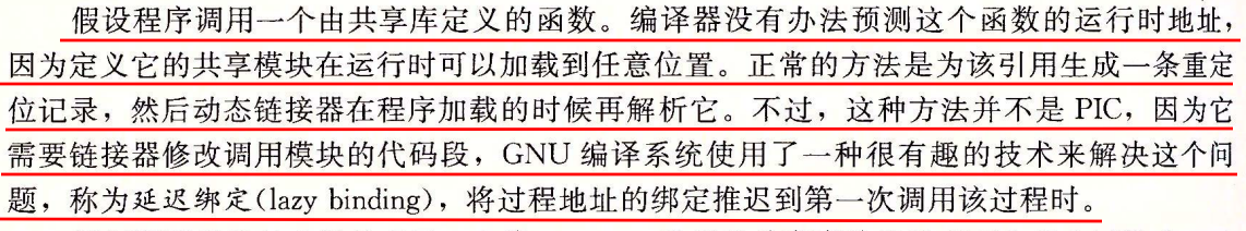 所以很明了了,第一次调用共享库函数的时候,没有对应的地址,这就需要通过动态链接器到已经加载到内存中的共享库寻址(如果没加载,先加载),寻址之后回填到GOT对应的表项;以后就可以直接寻址,即只需要plt中第一个jmp就行了,本例中以后的调用只需要执行jmp QWORD PTR [rip+0x200512] # 600a68 <_GLOBAL_OFFSET_TABLE_+0x18>(因为第一次调用的时候动态链接器已经寻址并将地址更新到GOT中,GOT对应的条目中不再只是简单的返回其PLT下一条指令的地址),后续的push、跳转到<show_me_the_money@plt-0x10>调用动态链接器寻址等都不再需要了。那这个过程就是所谓的延迟绑定。