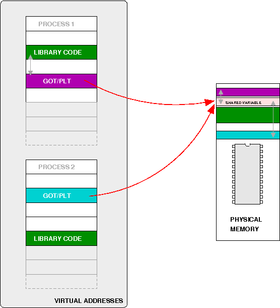 存在的问题是:动态链接在编译的时候源码文件和共享库并不是像静态链接那样生成一个包含两者的可执行文件,所以没有办法像静态链接那样可以通过编译时确定好的相对地址寻址。等到共享库被加载到内存(可执行文件加载一次,共享库加载一次,各加载各的),可执行文件在运行时怎样知晓共享库的内存地址并寻址到共享库的函数?