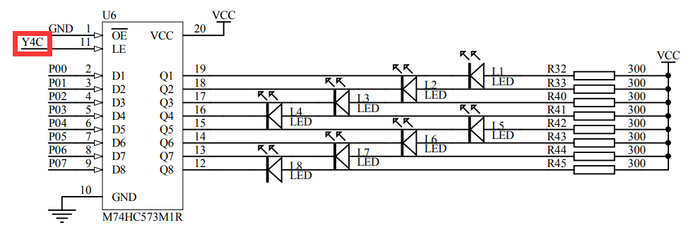 通过控制P2.7、P2.6、P2.5三个引脚的电平,便可以控制输出哪一位有效,进而去控制不同模块。例如,分别给P2.7、P2.6、P2.5引脚1、0、0,便可以控制Y4为有效,此时Y4为低电平。经过74hc00反相后变为高电平,此时输出的Y4C为高电平。在电路图中Y4C又连接着LED所对应的74HC573锁存器, 由上图可知,当Y4C为高电平时,输出Q1~Q7与输入D1~D7相同,此时P0口直接控制LED,为0点亮,为1熄灭。当Y4C为低电平时,数值被锁存起来,输出的Q1~Q7不变,即不再随着输入而变化。