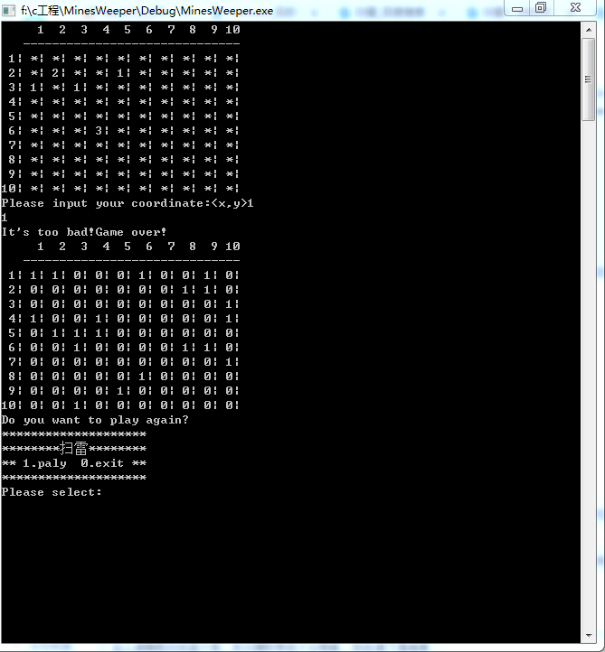 if(mine[x][y] == '1')//判断玩家所选坐标位置是否是雷。这里字符‘1’代表雷