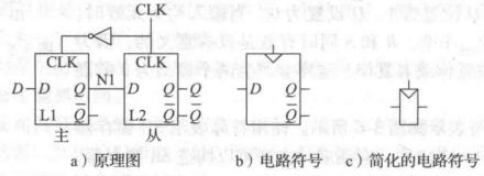 当CLK=0时,主锁存器将数据传送到从锁存器的D端,当CLK变成1时,从锁存器将D传到Q端。而主锁存器被切断,不能传输源端数据。D触发器只能在时钟上升沿才能将D传输到输出Q。
