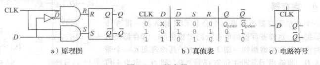 D锁存器,有两个输入,数据输入D和时钟输入CLK。当CLK(图中WE)=0时,S=R=0,输出端保持不变。当CLK=1时,Q=D。