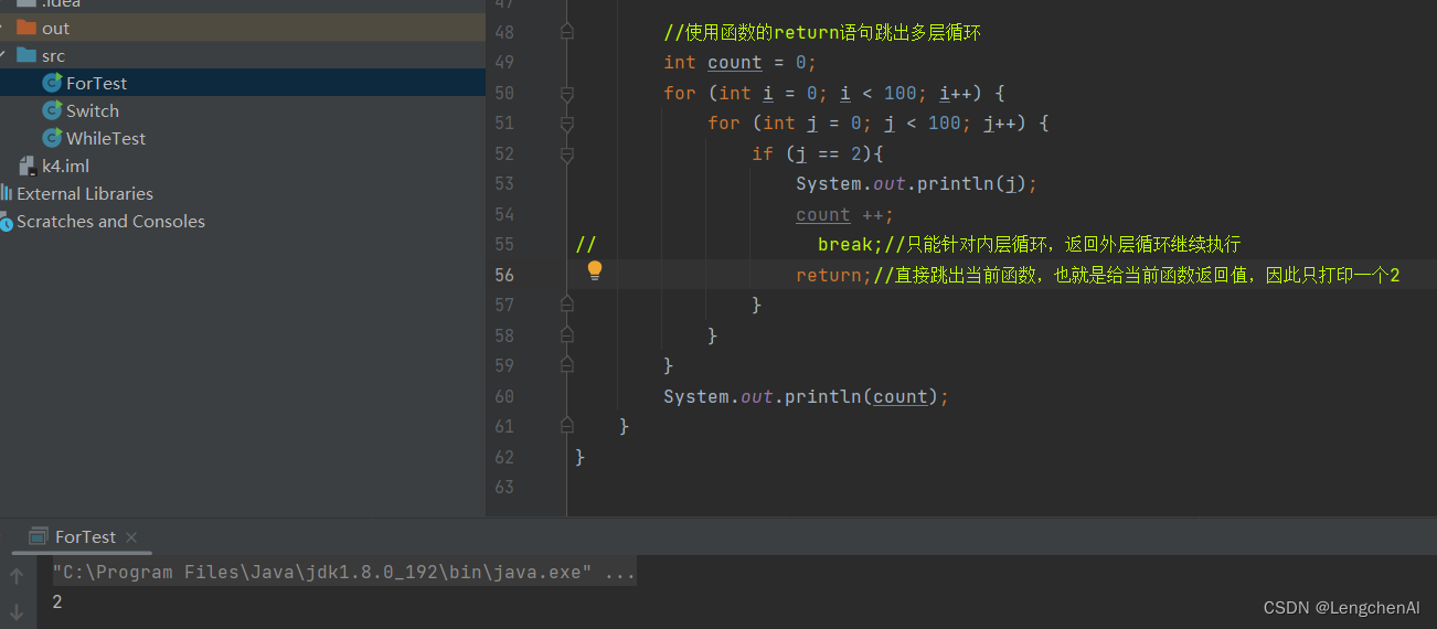 注意:break和continue只针对一个循环。也就是break只能跳出一个当前循环。continue也只能针对一个循环。如果要跳出多个循环,则使用标签或者函数的return语句(用处比较少)