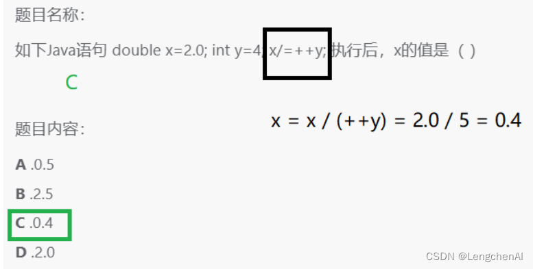 知识点2:x是double类型,y是int类型,两个进行除法运算发生类型提升,提升为double类型,因此结果为0.4