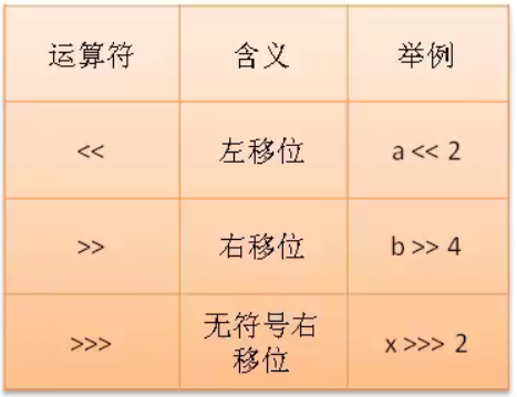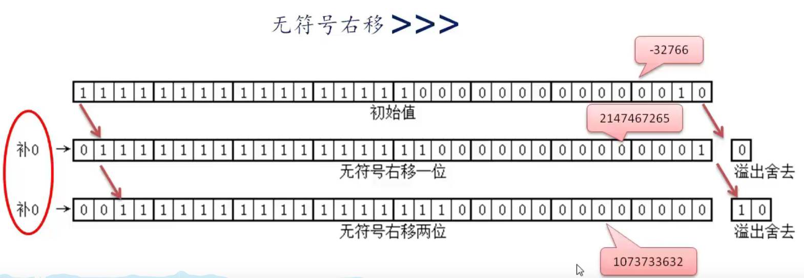 ③ >>> 无符号右移:高位补0。byte short不适合做无符号右移。