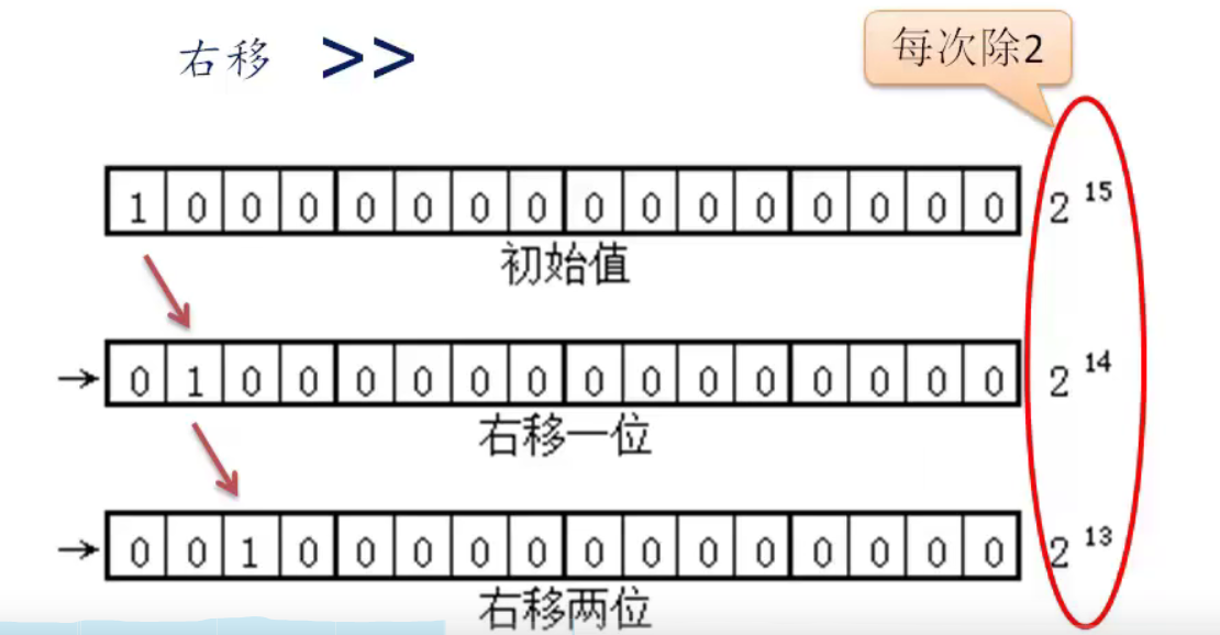 32768>>2:1右移2位,将32768的二进制位所有的往左移两位.