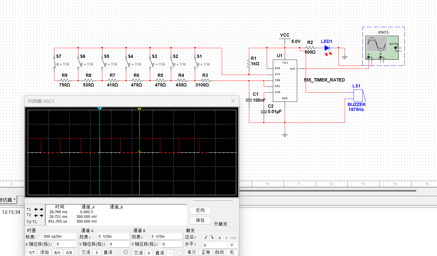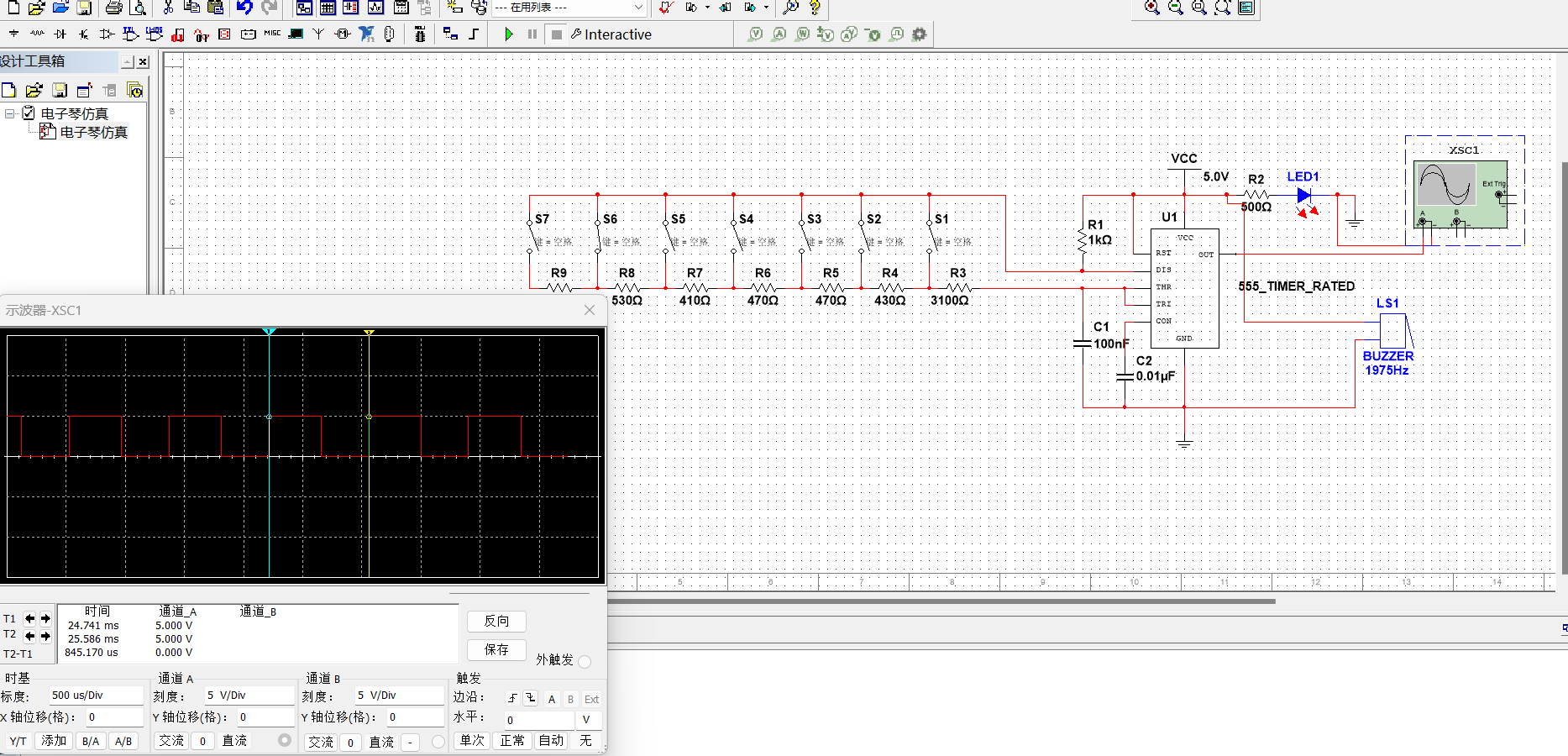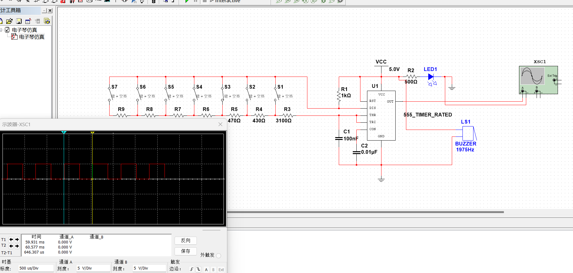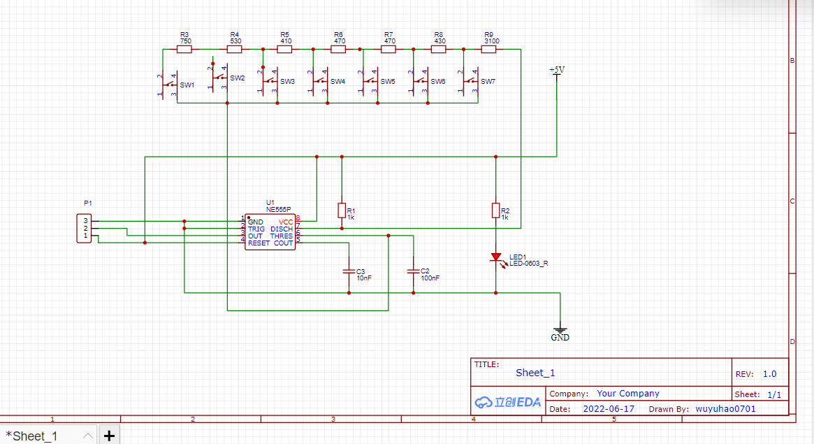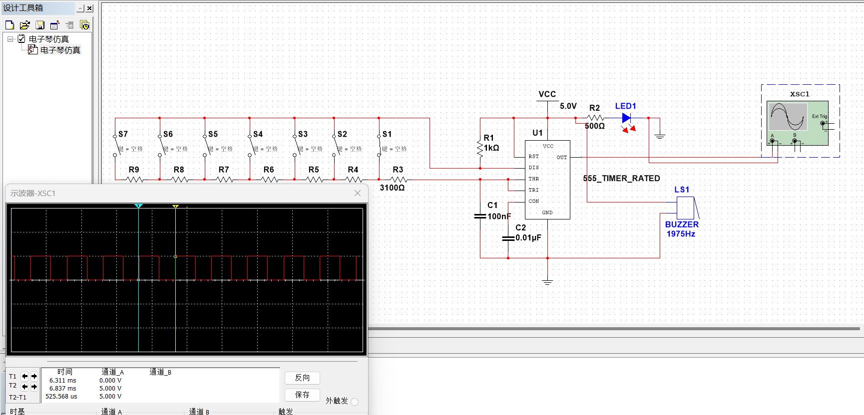 原理: 根据外接电阻阻值的不同,555定时器的3号管脚(OUT)可以输出不同频率的方波。而无源蜂鸣器发出的声音与输入的频率有关。基于这个原理,可以用多电阻串联的方式,加上开关。按下不同的开关,555定时器会输出相应音符的声音频率,通过蜂鸣器实现七个基本音符的发声,实现555定时器简易电子琴的制作。