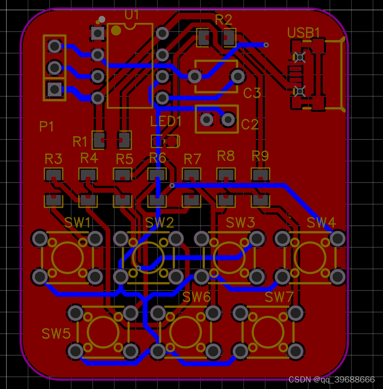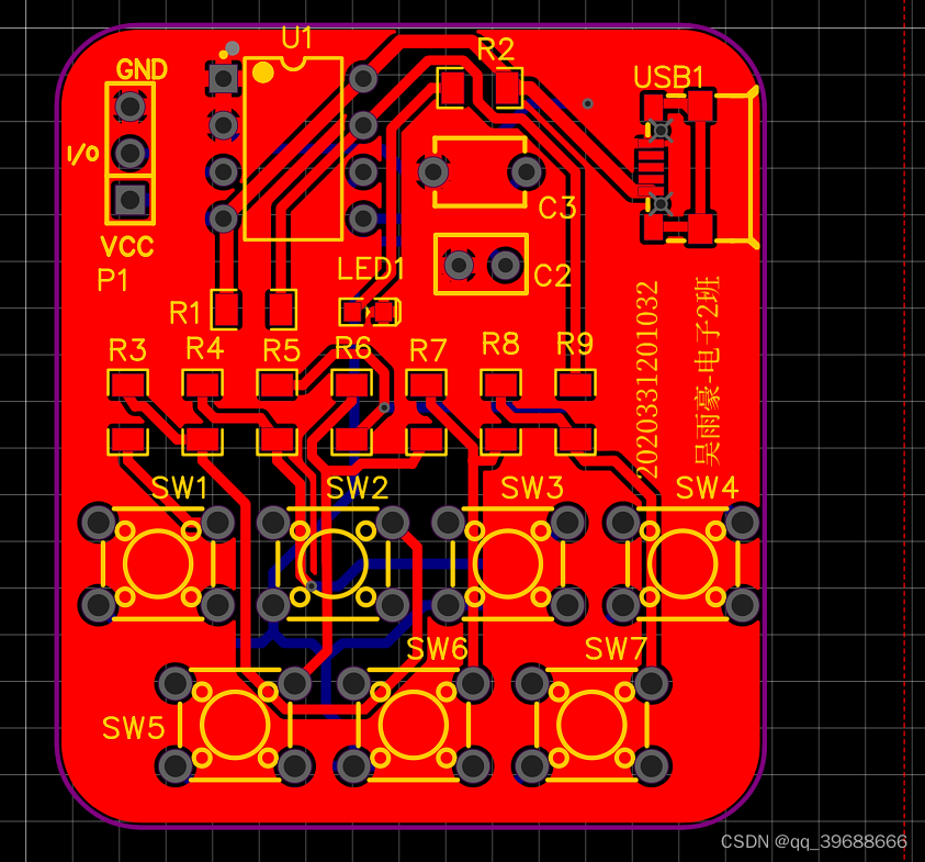 基于以上选择的封装,进行PCB的制作。首先确定元件的排布,在同一网络的元件尽量排在一块,并注意vcc和gnd的排线,重要信号线走线不宜过长。根据上述PCB基本布局规则,设计出如图PCB,其实际尺寸为38.4mm*43.18mm