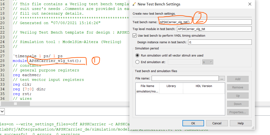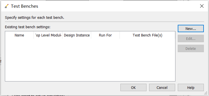 注:在Test bench and simulation files 区域中,单击add按钮可添加工程仿真目录下的激励文件,单击ok按钮完成参数设置并返回到激励文件对话框界面,继续单击ok按钮完成仿真工具参数设置。