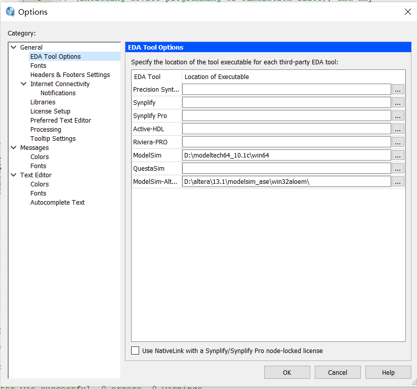 依次单击tools->Options菜单,在弹出的软件设置对话框依次单击General->EDA Tools->Options 即可弹出集成工具选项设置对话框。