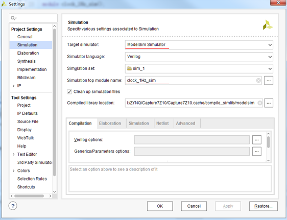 设置仿真工具,点击菜单Flow->Settings->Simulation,选择ModelSim Simulator进行仿真,仿真文件设置为clock_1Hz_sim。