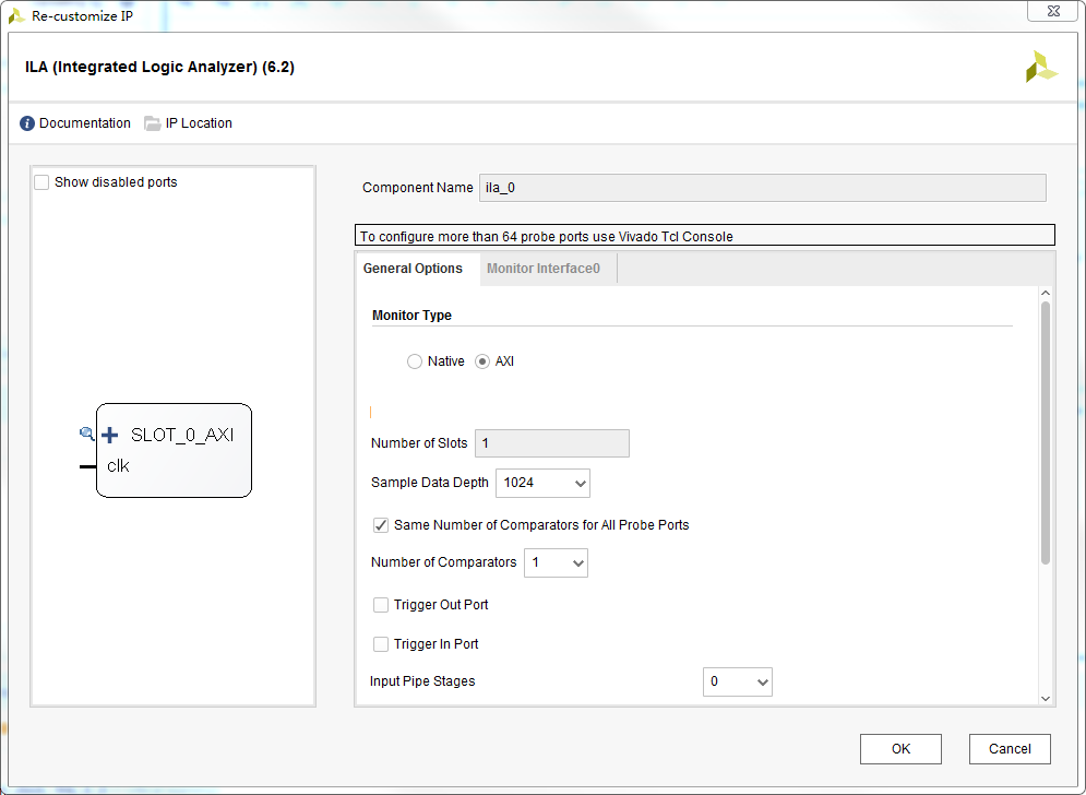 2. 新建ILA时弹出ILA配置界面,这里需要配置采集信号的时钟深度,信号宽度,保持默认即可。