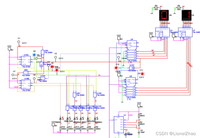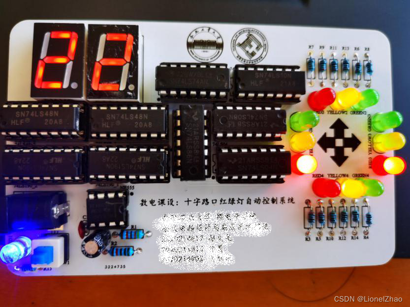 综上所述,通过实物验证,构成电路的五个模块:由NE555构成的多谐振荡器、由74LS190构成的倒计时电路、由74LS48构成的数码管驱动及现实电路、由74LS74构成的状态控制器、由逻辑门构成的红黄绿灯控制逻辑都是正常工作的,只是倒计时置数电路有一个未知的问题,导致了黄灯闪烁25秒、红绿灯常量5秒,与设计不符。