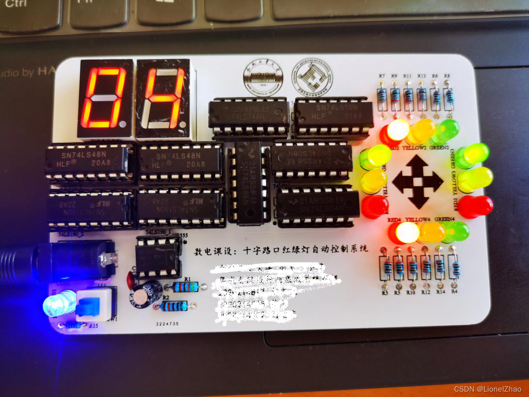在检查之后又重新绘制了PCB,并想出来用四组LED拼凑一个十字路口红绿灯的想法,并实现了出来,如下图所示: