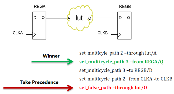 再比如,对图示路径依次进行如下四条时序例外约束,优胜者将是第二条。但如果再加入最后一条约束,false path的优先级最高,会取代之前所有的时序例外约束。