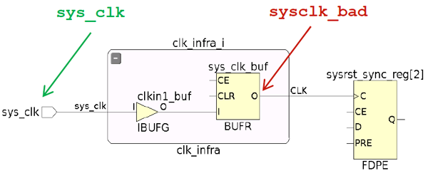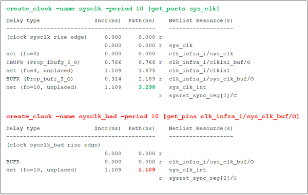 用create_clock定义的主时钟的起点即时序的“零起点”,在这之前的上游路径延时都被工具自动忽略。所以主时钟创建在哪个“点”很重要,以下图所示结构来举例,分别于FPGA输入端口和BUFG输出端口创建一个主时钟,在时序报告中体现出的路径延时完全不同,很明显sysclk_bad的报告中缺少了之前一段的延时,时序报告不可信。