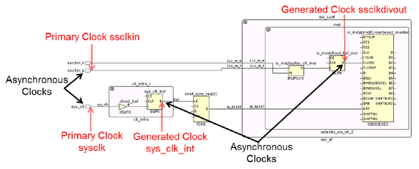 如上图所示,两个主时钟ssclkin和sysclk由不同的端口进入FPGA,再经由不同的时钟网络传递,要将它们设成异步时钟,可以使用如下约束: