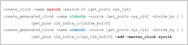 MMCM/PLL/BUFR的输出时钟都可以由Vivado自动推导,无需用户创建。若用户仅希望改变衍生钟的名字,其余频率等都由工具自动推导,则只需写明三个option,其余不写即可:create_generated_clock [-name arg] [-source args] [-master_clock arg] 工具不能自动推导出衍生钟的情况,包括使用寄存器和组合逻辑搭建的分频器等,必须由用户使用create_generated_clock来创建。