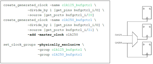 在很多情况下,除了共同的扇出,其中一个时钟或两个都还驱动其它的时序元件,此时建议的做法是在clkcore_buf的输出端上创建两个重叠的衍生钟,并将其时钟关系约束为-physically_exclusive 表示不可能同时通过。这样做可以最大化约束覆盖率,也是ISE和UCF中无法做到的。