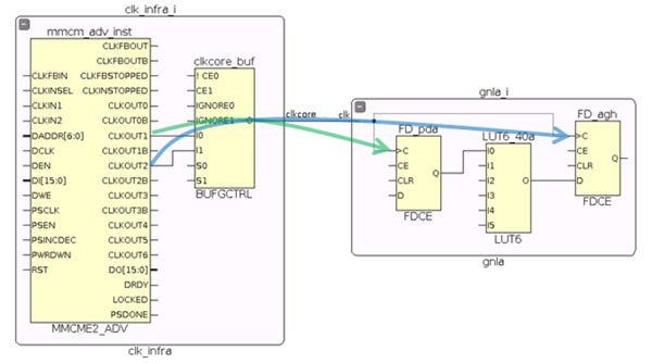 如下图所示,clk125和clk250是clkcore_buf的两个输入时钟,不约束时钟关系的情况下,Vivado会对图示路径做跨时钟域(重叠时钟之间)分析。这样的时序报告即便没有违例,也是不可信的,因为clk125和clk250不可能同时驱动这条路径上的时序元件。这么做也会增加运行时间,并影响最终的实现效果。
