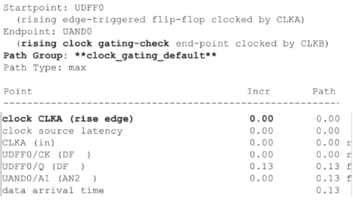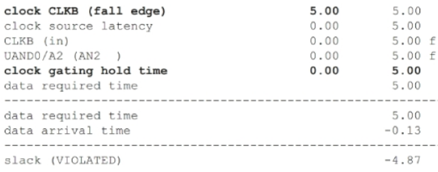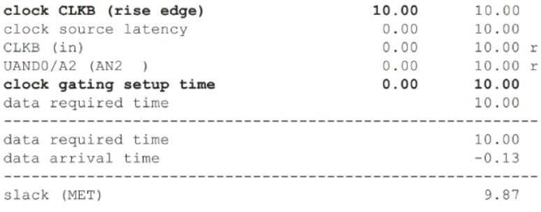 运用提到的定义,对于上图来说,CLKB才是clock signal。接下来我们以这个电路为例看看如何进行clock gating check(对于这个与门来说,有些类似于data to data check):