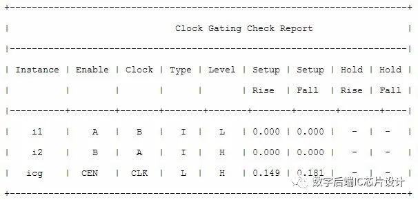 这个报告中列出了clock gating cell的名字,enable pin, clock pin,type(I代表inferred clock gating cell(电路结构中推断出来的); L代表library clock gating cell(library中已经定义好的icg cell))还有timing信息