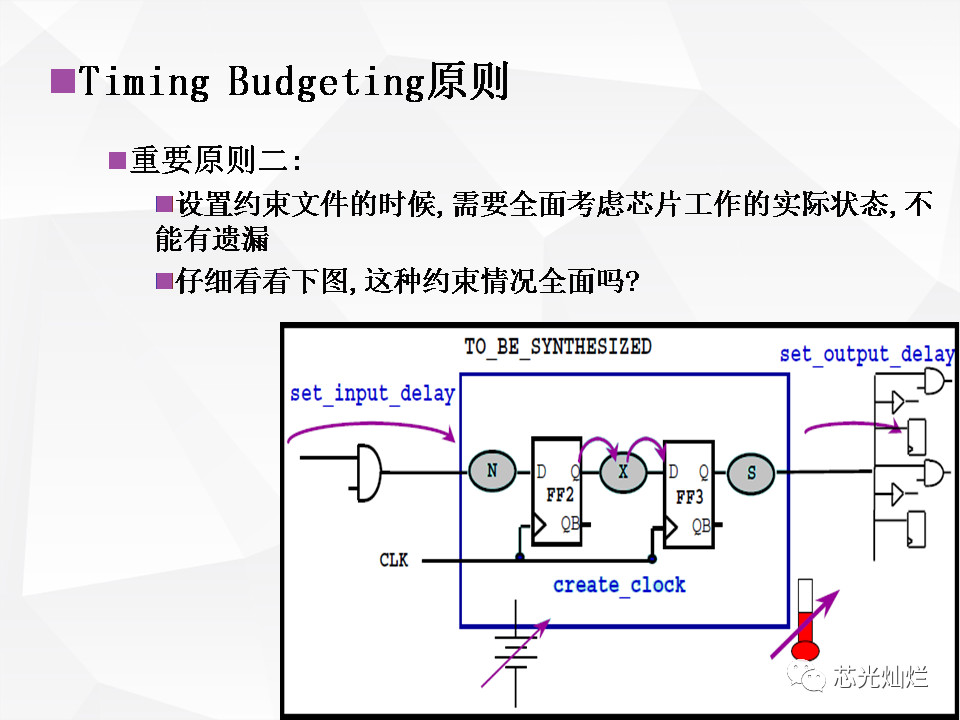 - 涉及 Timing Budgeting 的问题,属于综合约束设计中的高级问题;牵扯到综合的策略和方法以及要实现的效果,这几点要从整体上把握