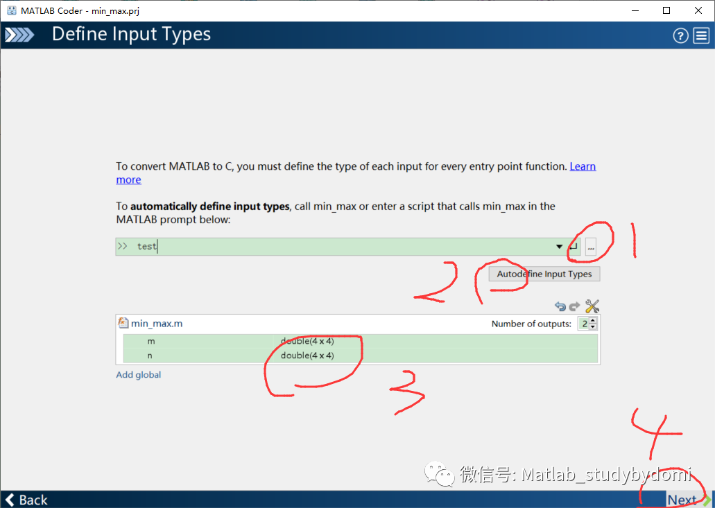 选择函数的入参,可以手动输入,也可以通过测试函数自动输入。指定输入数据类型的,比如说你的两个相加矩阵是多大的呀,是int还是double等等。这里有两种方式,一种是根据函数的使用实例自动确定输入类型,一种是自己手工确定输入矩阵大小等等。那么一般的话,如果你知道你的矩阵大小,或者简单的函数,用第二种完全可以,但是有些时候,比如说我们的输入是一个大结构体,结构体里面超复杂,你怎么去一个个确定里面的什么输入。这个时候第一种第一种很好了,那么第一种方式什么意思呢?就是让你自己建立一个脚本(不是函数),然后脚本你们包含了你的这个函数的用法