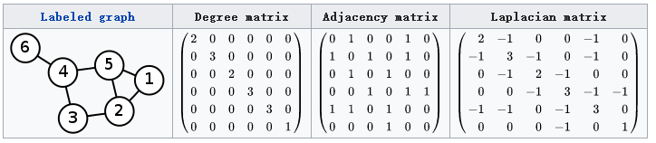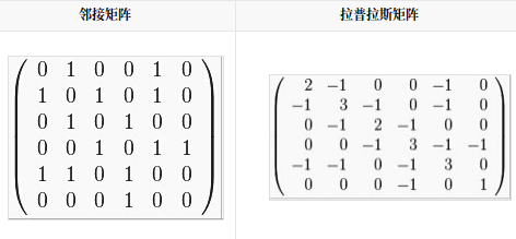 - L=D-A: D----度矩阵,A----领接矩阵