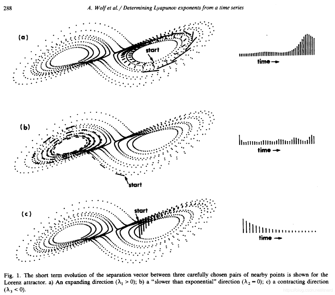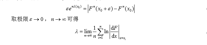 假设在一维动力系统 Xn+1=F(Xn),为了表示从整体上看相邻两状态分离的情况,必须对时间(或迭代次数)取平均,不妨设平均每次迭代所引起的指数分离中的指数为λ,原 来相距为ε的两点经过n次迭代后[相距为]: