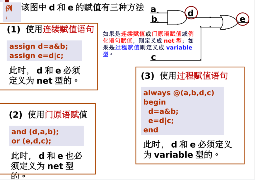 - 使用何种赋值语句对该信号进行赋值,如果是连续赋值或门原语赋值或例化语句赋值,则定义成net型;如果是过程赋值则定义成variable型