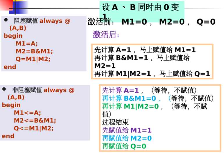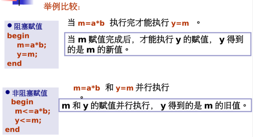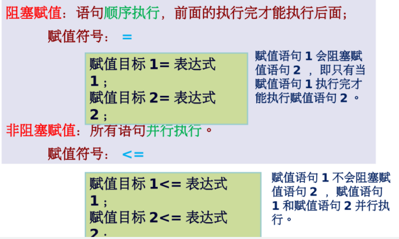 - 阻塞赋值的实质:右边表达式的计算和对左边的赋值是一个统一操作,之间不能再插入其他任何动作,即马上赋值。