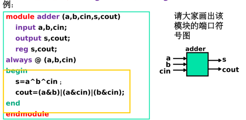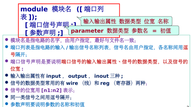 - 模块是以关键词module开始,以关键词endmodule结束的一段程序。