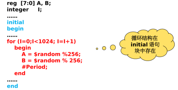 - 在initial语句块中用循环语句块产生按一定规律变化的信号的激励码