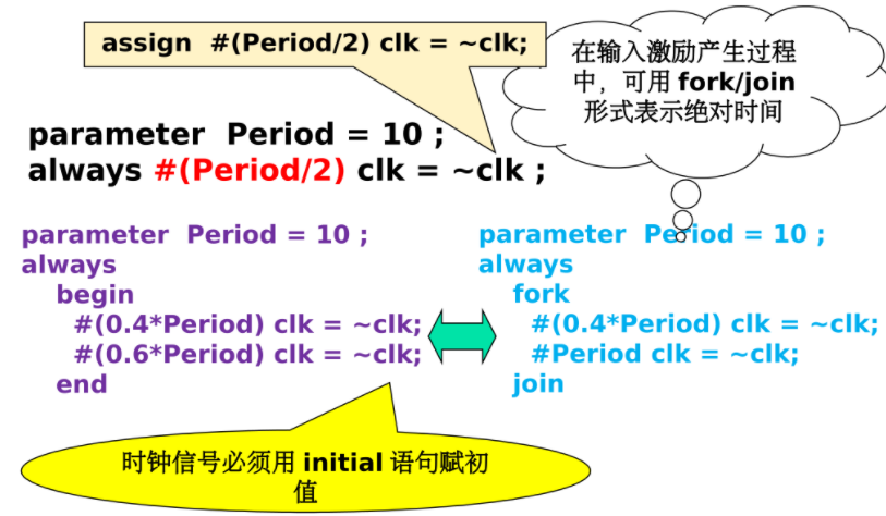 - 用单独的always语句或assign赋值语句产生时钟信号