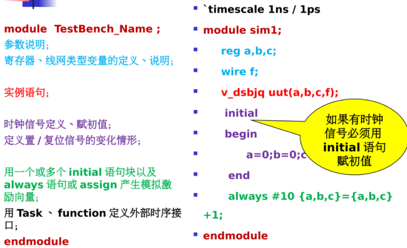 Verilog HDL提供了一种灵活有效的产生输入信号波形的方式---写测试程序( test bench), 就是用一段程序产生激励信号,用语言描述信号的变化。