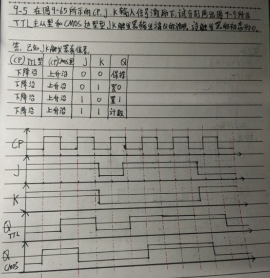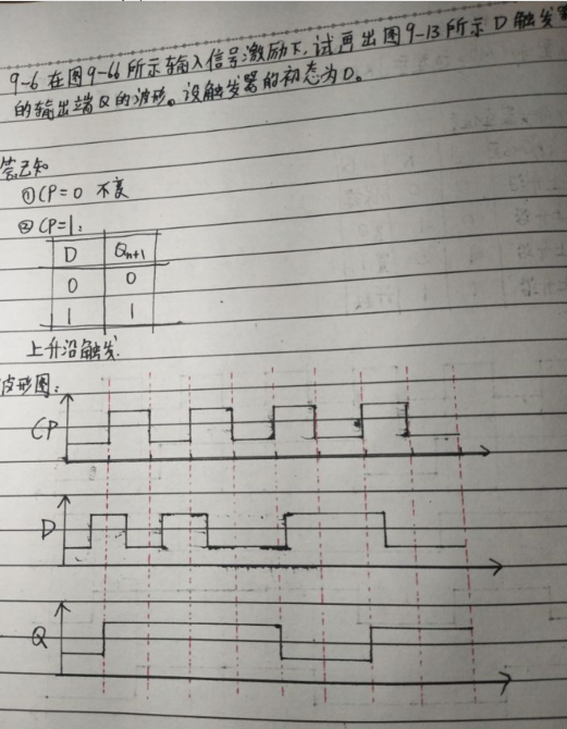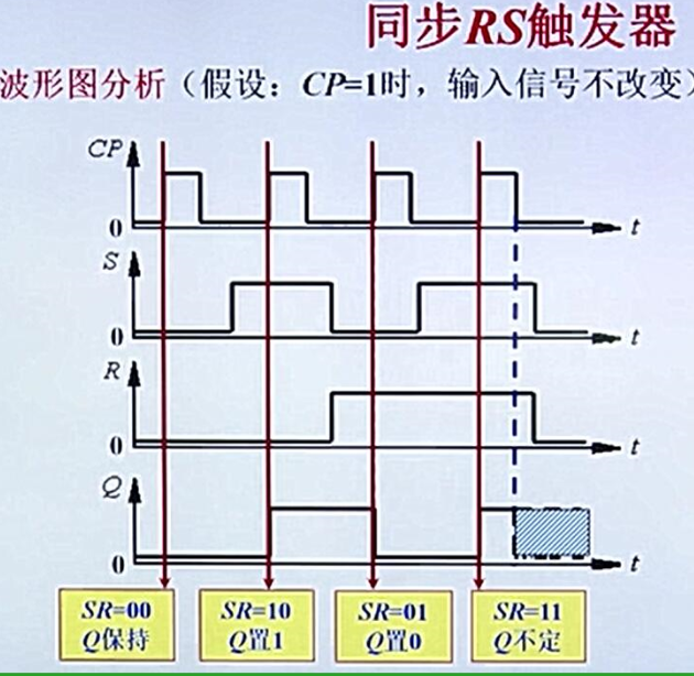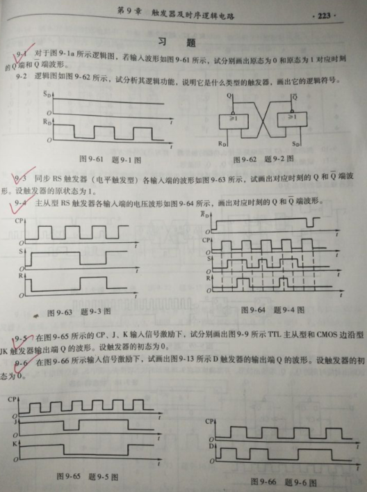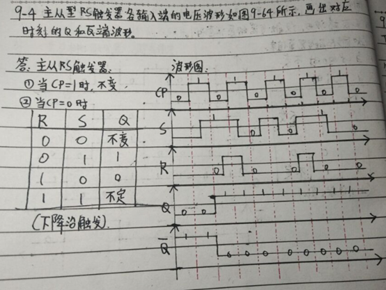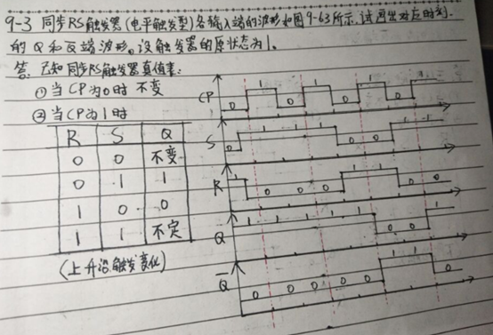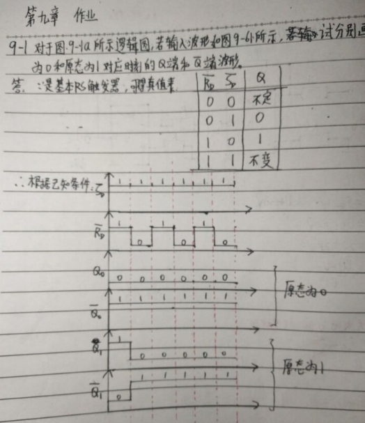 波形在例题9-1,总体来说就是只要R或者S其中一个变了,那么输出Q可能会发生转换,所以要重新判断,其余情况保持即可。