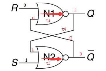 ·输入S=1,R=0时,根据或非门的功能,由于S=1,N2的输出Q’= 0;于是N1的输入就是00,输出Q就等于1;然后Q=1反馈回N2的输入,让N2的输出稳定为0,从而让Q的输出稳定为1;输入SR=10时,输出Q=1,称为置位功能。(这里我们看一下,在SR=10时,S的信号稳定多久输出Q和Q’才稳定下来:S=1到来,首先经过N2的门延时t1,然后是Q’反馈回N1的线延时t2,接着是N1的门延时t3,再然后是Q反馈回N2的门延时t4,也就是有2个门延时和两个线延时,这是对于Q’的;对于Q还有增加一个N2门延时和一个Q’反馈回N1输入的线延时)如下图所示: