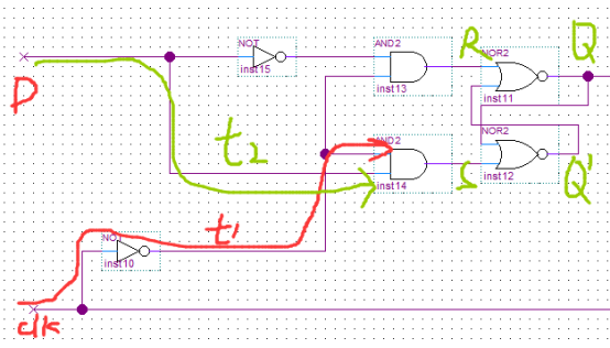 假设在T=0ns的时候,clk从0变成1(为方便分析,假设时钟是理想的,没有跳变延时)。我们假设一个数据D1=0在T=-0.7ns(即比时钟上升沿提前0.7s)的时候到达数据的端口,然后另一个数据D2=0在T=-0.3ns的时候才来到数据端口(也就是说,D1来得早,而D2来得比较晚即建立时间不足)。然后D1这个0翻山越岭越过了反相器,变成1,经过了与门(由于与门的另一个输入为1)变成了1,经过或非门之后,使输出Q变成了0,也就是变成了从锁存器要锁存的0值。然后主锁存器Q刚输出0的时候,还不稳定,需要通过反馈使得自己的或非门的输入为1就是需要t1+t2+t3的时间(如下图所示)进行维持Q的稳定。