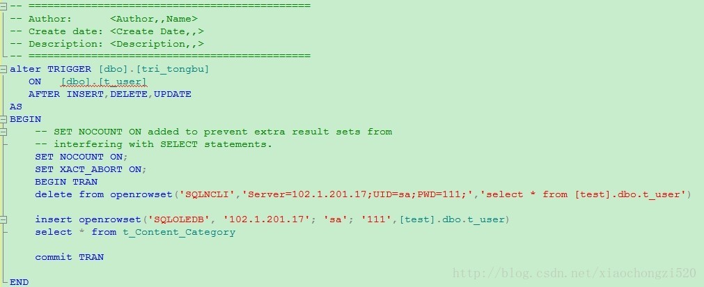 2.在作为数据源的数据库服务器上对应的表上创建触发器:(204.17是数据源服务器,201.17是要同步的服务器)