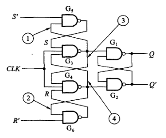 - 首先在电路增加G5,G6两个与非门和①②两根连线,时G3,G5;G4,G6分别形成SR锁存器。
