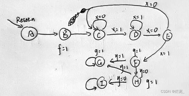 实际就是两个序列检测,使用摩尔型状态机的时候每个输出都需要有各自的状态,因此我们可以画出状态图如下