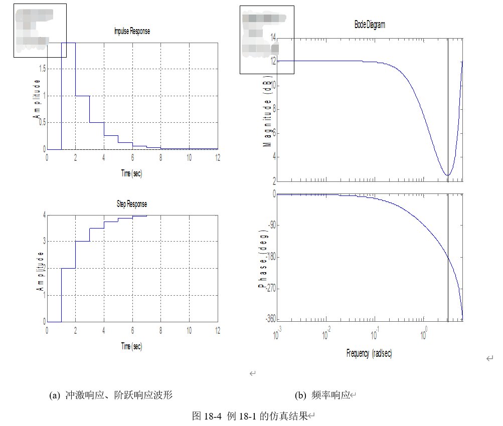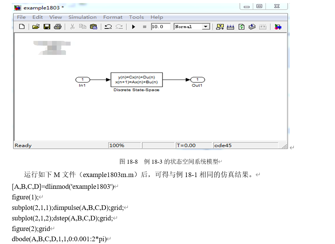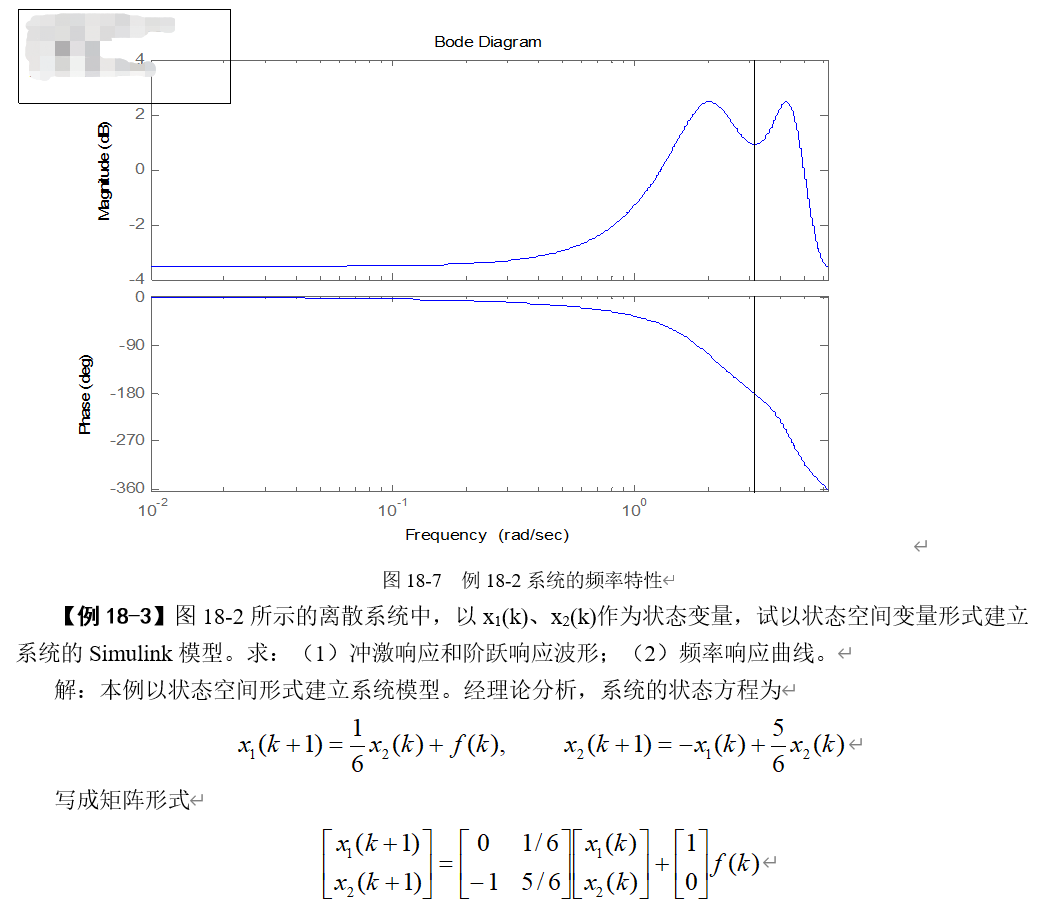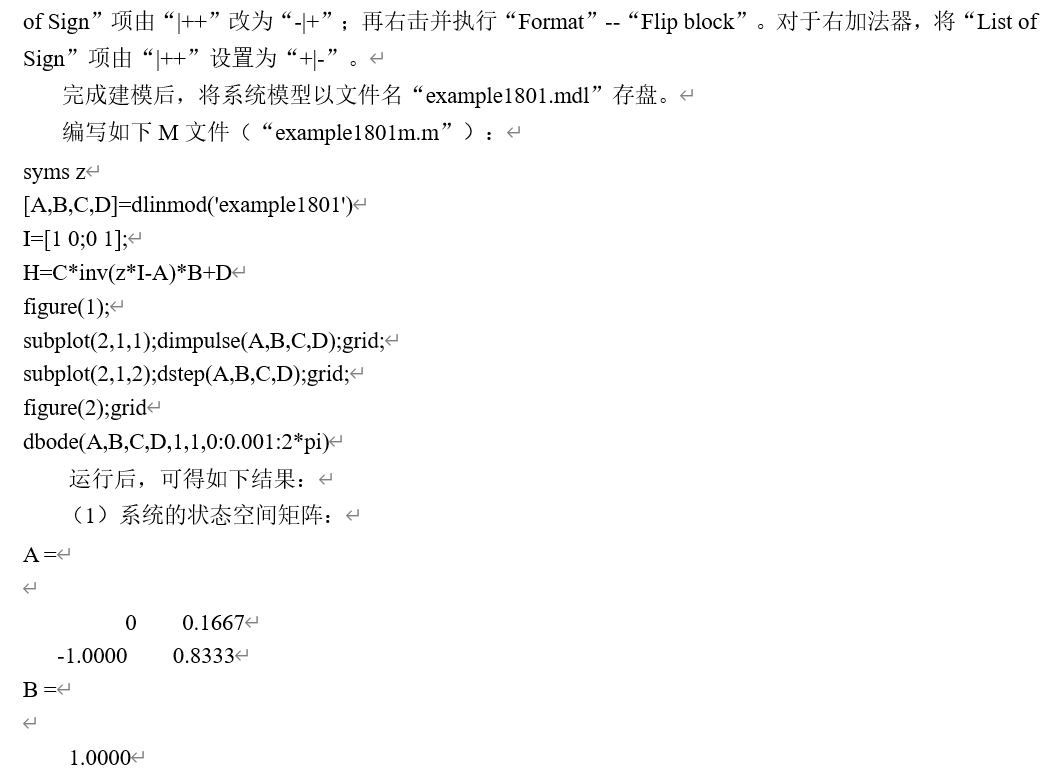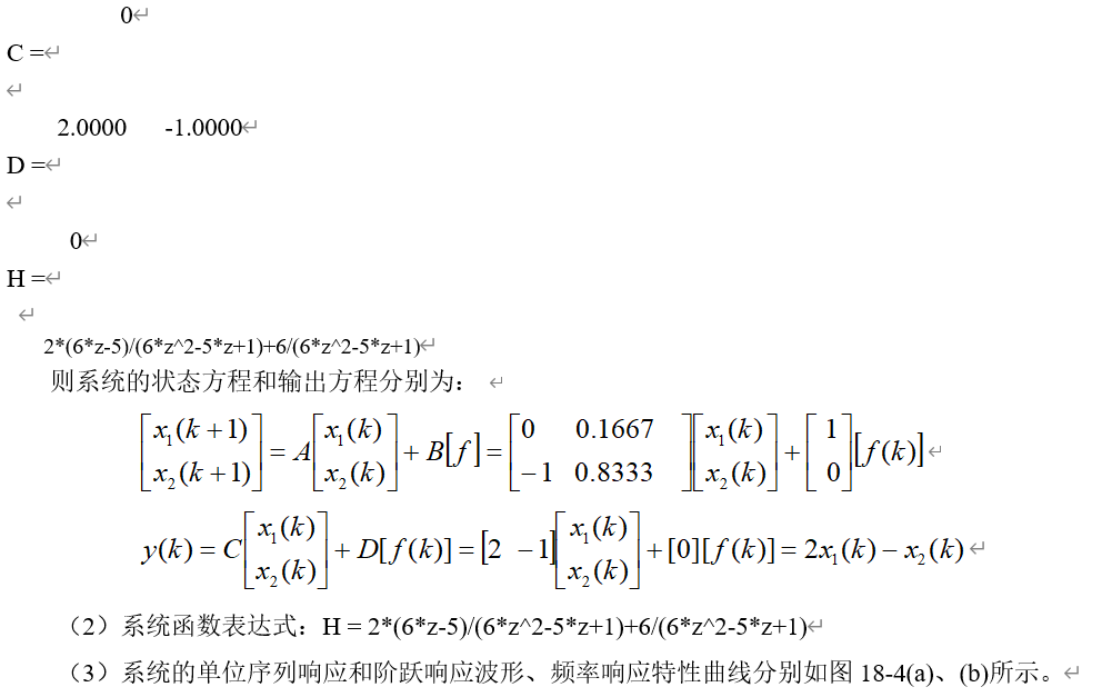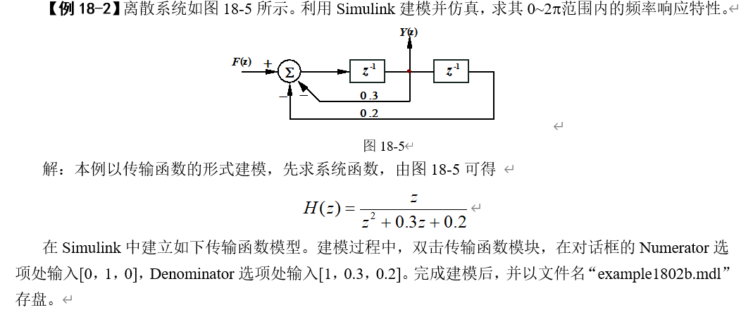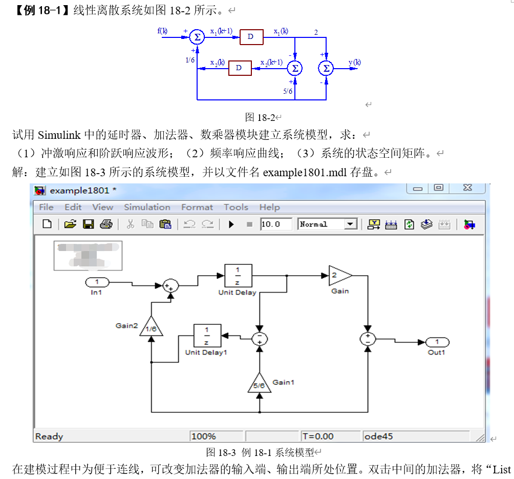1.离散系统时域框图如图18-9所示。建立Simulink模型,求其状态空间矩阵、系统函数表示式、冲激响应、阶跃响应和频率特性。
