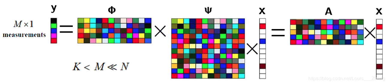 其中A∈M×N称为观测向量。对具体问题而言,Φ和Ψ为已知,因此A 也已知,从而可以通过观测向量y求得系数向量x,然后再重构出原信号 。常用的测量矩阵有随机高斯矩阵,随机伯努利矩阵,及其他随机矩阵。
