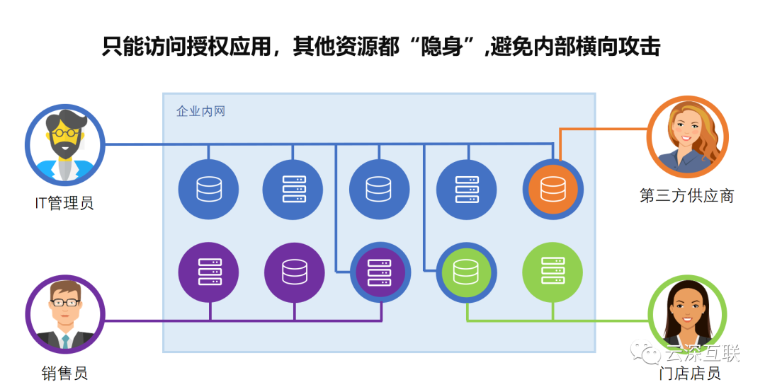 零信任网络则可以在任何时候都限制对所有用户的访问,随着网络攻击者的攻击手段变得越来越先进,VPN不足以阻止他们,但是基于零信任网络,无论攻击者是否已经获得用户的授权凭证,他们的行动都将受到限制,遵循最小授权原则,所有其他资源对用户不可见。零信任网络可以划定一个清晰的边界,在网络中使用微分段创建安全区域以此加强网络的安全性。
