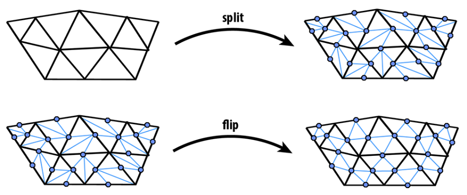 - Split:对每一条旧边执行split操作,可按任意顺序执行。具体操作为:按照该边中存储的前一步已计算好的新顶点的坐标将该边断成两条边,并插入2条边连接新顶点与所处三角形的对角顶点(如果该边是边界,则新插入的边为1条)。