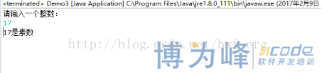 | public class Demo1 { public static void main(String[] args) { Scanner input=new Scanner(System.in); System.out.println("请输入一个整数:"); int n=input.nextInt(); boolean isPrime=true;//假定该整数是素数 if(n<=1)isPrime=false;//小于等于1的整数不是素数 else{ for(int i=2;i<=n/2;i++){ if(n%i==0){ isPrime=false; break;//在[2,n/2]之间的约数,不需要循环判定了,结束循环。 } } } if(isPrime)System.out.println(n+"是素数"); else System.out.println(n+"不是素数"); input.close(); } }