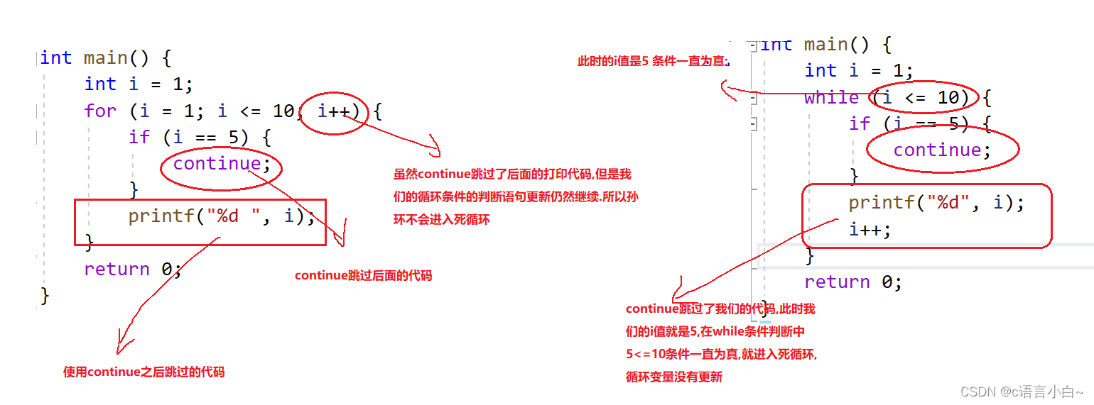 此时我们使用了continue时,程序并没有停止而是出现了死循环.那么我们的continue就是跳过continue后面的代码直接判断是否可以执行下一次循环,我们上面的代码就是在i=5的时候,continue跳过了后面的代码,直接去判断我们的循环条件是否成立,成立就继续进行我们的代码,但是此时是不执行continue后面的代码的.所以我们的程序出现了死循环(此时我们的n是4,条件判断为真)